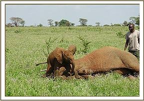 This elephant calf and its dam were in a herd of eight elephants. We first immobilized the mother using Etorphine hydrochloride 14mg into its thigh muscle muscle. As the drug took effect the rest of the herd was chased away by vehicle and the calf restrained physically using ropes for treatment.