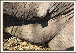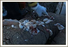 The elephant showed lameness and a swollen right forelimb with a penetrating wound 5cm in diameter and 15cm deep caused by a sharp object into the muscles of the arm. There were two penetrating wounds with extensive necrotic tissue on the left thoracic area also deep caused by sharp object.