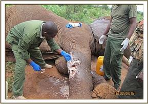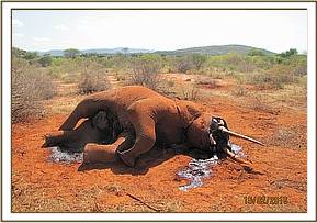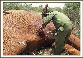 The carcass was decomposing and the tusks were easily pulled out. The surrounding ground indicated signs of struggle before death. The trunk and the facial soft tissues were eaten off by carnivores. The intestinal organs were all eaten away hence no vital organs were accessible for autopsy. There were bruise marks around the perineal area indicating blunt object hit.