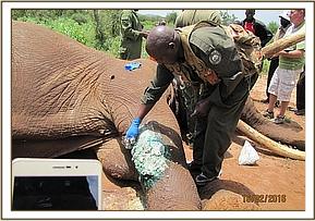 The elephant was immobilised using 18 mgs of Etorphine in a dan-inject dart and loaded into a dart gun, the helicopter was used to separate the two bulls and drive the injured one to an open area. He was darted in the rump and kept in the grassland by the helicopter. He went down after 14 minutes.