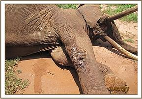 A report was made of a limping elephant bull that frequently drank water at the Kilaguni Serena water hole. Previous attempts to locate him were not successful but he was finally spotted near the lodge on the 20th February in so much pain he was lying down which is a rare occurrence for an adult elephant.