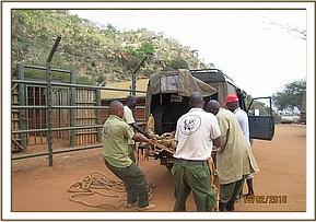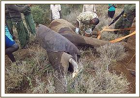 Reversal of the anaesthetic was attained by intravenous administration of Diprenorphine hcl at 3 times the Etorphine dose. He struggled to get up so a vehicle was called in and ropes were used to assist the elephant onto his feet.