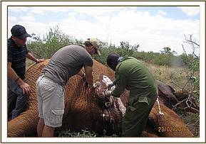 The carcass was in early stages of putrefaction and aged at about 2 days since time of death. The skin was intact apart from the chopped off face area. There were no signs of struggle and the carcass was lying on the left flank on a dried up stream facing the Galana River direction from the Yatta plateau. The prepucial skin and the anal opening had carnivore bite marks.