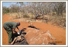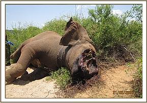 The male carcass was lying on the right flank and was in an advanced stage of decomposition; aged at about 3 weeks since the time of death. Not much could be deduced from the carcass but signs of a snare were visible. Tissue samples were taken for the genetic bank.