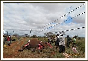 Rangers from the Ngutuni sanctuary reported a dead young bull that was spotted near the Standard Gauge Railway that is currently under construction near Voi town. He was freshly dead and the neighbouring community were already dividing the meat among themselves. Low hanging live high voltage power lines was evidence enough of the cause of death.