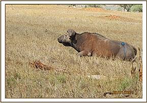 The buffalo was immobilized using 9 mgs of Etorphine mixed with 70 mgs of Xylazine and it went down in 5 minutes. The strong wire snare was removed from the neck leaving only small neck wounds. The buffalo was administered with Dexamethasone Hcl and a long acting antibiotic parenterally.