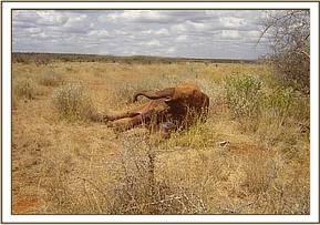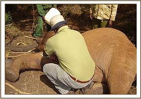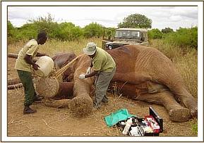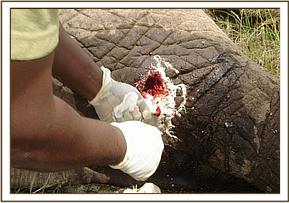 Tsavo Cases The first case in Tsavo was a bull aged about 40 years sighted at Kanderi (Tahri Camp) on the night of the 14th. It had two arrow injuries, one at the left chest area and the other on the lower right fore leg. The one on the chest was dry and uninfected but the one on the leg was infected and made the animal limp as it walked. We managed to track and find it the following day in the company of a family group about eight-km north of the camp along Voi River. We successfully immobilised and treated it. We have not been able to find it to assess the progress but that will be done in due course.
