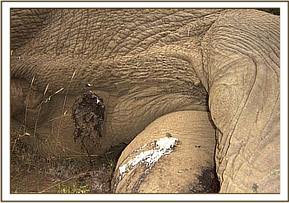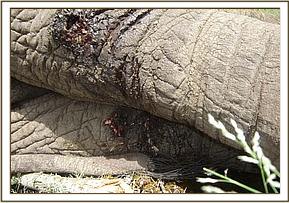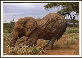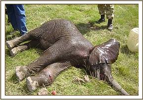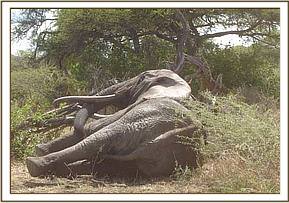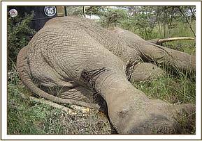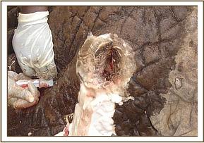 The bull said above was aged about 60 years old. It sustained serious injuries at the rear from another younger bull during a fight for a female on oestrus. A tusk went in on the left side on the rear and came out one foot above causing extensive muscle tearing internally. We were informed that it had bled heavily before we arrived to the extent that they thought we might find it already dead. We however found it alive but weak.