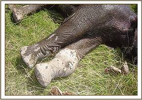 The other case was a young female aged about six years first treated at Luarenyi ranch on the 17th and a second treatment was administered eight days later on the 25th in the neighbouring Taita Wildlife Sanctuary (Salt Lick). It had what we suspected to be a bullet injury on the inner side of the left fore leg at the elbow joint area.
