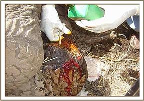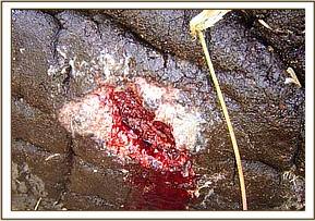 Nearby the same day, there was a bull aged about 40 years with serious multiple spear and arrow injuries all over the body.