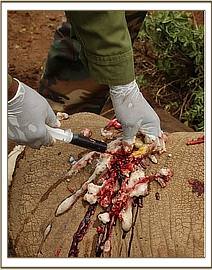 The waterbuck was immobilised with 6 mgs of Etorphine Hcl mixed with 40 mgs of Xylazine and went down in 4 minutes. Examination revealed an extensive deep cut on the fetlock joint by the tough wire snare that nearly severed the hoof. The joint was completely damaged with skin, ligaments and synovial cavity all damaged exposing the distal condyle of tibia. The injury was given poor prognosis hence the waterbuck was euthanized by administration of 20 CC of euthanaze (20% Pentobarbitone Sodium) by rapid IV injection through the jugular vein.