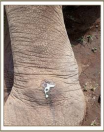 The trunk and the ear were positioned correctly to aid in breathing and temperature control. There was a deep penetrating wound to the left hind leg just above the sole area with pus oozing out. Probing using clean tissue forceps indicated a deep penetrating wound that affected the joint. The wound was washed clean using water mixed with Hydrogen peroxide, necrotic tissues and pus were removed then the wound doused with tincture of iodine. Green clay was used to cover the wound. Long acting antibiotics were administered IM and dexamethasone Hcl given IV through the ear. Cause of injury is suspected to be a spear. After the treatment was done, the rest of the team were instructed to leave the area as the vet administered the reversal drug.
