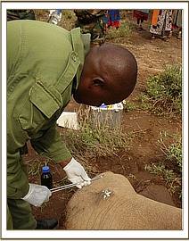 Thee anaesthesia was reversed using Diprenorphine at 3 times the Etorphine dose. Other graze wounds from falling were also treated. The body condition of the elephant was not very good hence she was assisted onto her feet.