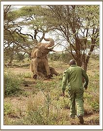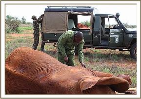 A report of a lame huge elephant bull was received from the senior warden of Amboseli National Park. The well-known elephant bull with massive tusks had been seen days before with other bulls foraging and looking fine near the park, but today he was all alone near Kimana gate struggling to walk. As the Amboseli unit was away on off duty, the Tsavo vet was airlifted by DSWT aeroplane to Amboseli National Park. After landing they drove to the area to find the huge bull under a tree relaxing all alone with an obvious injury to one of his limbs. Darting equipments and immobilization drugs were prepared.