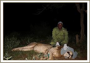 Using night vision equipment the male lion was immobilized using 300 mgs of Ketamine and 4 mgs of Meditomidine Hcl after responding to a calling station near one of the hotspots.