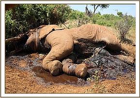 The carcass was lying on the right flank and at mid-advanced state of decomposition. There was scavenger activity on the carcass with the tusks still intact. The abdominal contents and the trunk had been scavenged. The skin was removed from the carcass to expose the whitish subcutis and examine any penetrating wounds but none were found. The carcasses were rolled over to expose the left flank and autopsy undertaken with no signs of external injury observed. Tusks were retrieved and taken for safe custody. Time from death was placed at 5 days. The death is from natural causes.