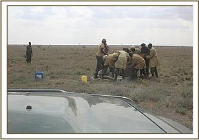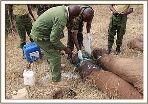 Further away in Satao another calf aged at 4 years had collapsed and the mother nearby was examined, cooled down with water whilst the calf was covered with a blanket because he appeared in shock and 20 cc of dexamethasone Hcl administered through the ear vein followed by a bolus of 50% dextrose by slow IV. The breathing and pulse improved. Further administration of antibiotics, Vitamin B12 complex and more IV fluid therapy was instituted.