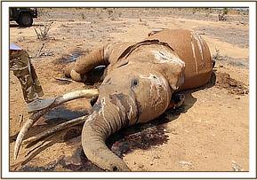 The carcass was lying on the left flank and at mid-advanced state of decomposition. There was scavenger activity on the carcass with the tusks still intact. The skin was removed from carcass to expose the whitish subcutis and examine any penetrating wounds but none were found.
