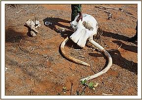 A third carcass belonging to an old carcass with bones scattered in the area but tusks intact, cause of death unknown.