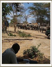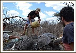 Attention now turned to the big tusker, “Mshale” who was wandering away from the drinking trough at the time, the tractor having been summoned to be at hand should he need to be turned over in case he fell on the wrong side. The moment the immobilizing dart struck Mshale in the rump, he ran off at speed. A search through the dense bush then ensued to establish where he had fallen, which turned out to be not terribly far away. There he lay like a red mountain, dwarfing the men that surged around his huge recumbent body as the vet investigated the wound. Fortunately the wound was on the upside of his body. Also very fortunately, no arrow head was imbedded, so Mshale was revived, having had the visibly infected wound anointed with the magic green clay.