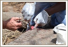 Upon the vet’s arrival both elephants were immobilized. It was a relatively simple procedure to remove the arrowhead from Challa’s face, but it transpired that Mulika’s wound, which the Keepers thought was just a glancing cut, turned out to be much more serious. The arrow had penetrated deep but fortunately had bounced off a rib; otherwise it would have been fatal. After much probing deep inside her body, the arrow was found and removed, and both elephants were given a long acting antibiotic injection before being revived.