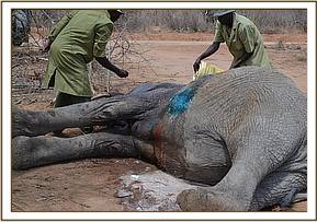 After all the elephants had milled around awaiting their turn to take water, and had moved away from the trough, Galana was singled out first as she clearly remained with a poisoned arrow embedded in her body. Galana’s operation was quick and an arrow was removed. Fortunately it had obviously entered her body at an angle, so it was not dangerously deep. Her wound was cleaned, packed with green clay and Galana was revived. All this took place with the concerned orphans looking on curiously. Mulika was then singled out by the Keepers, who kept the others at bay while she was darted. As the drug began to take effect, Dr Poghorn rushed forward to give her a shove in order to ensure that she fell on the correct side to enable him to deal with her wounds.