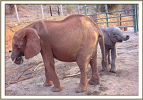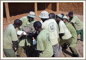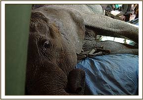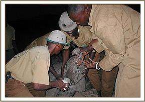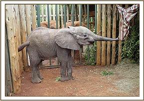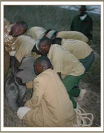 They say that things go in threes and just a week after the rescue of little Narripi, at 2 a.m. during the early hours of 7th September 2005, a call came from David Njoroge, Head of the Burra De-Snaring Team, to say that another orphaned baby bull elephant had been brought to the Voi Stockades; that it was just a year old, and therefore milk dependent, and would need to be airlifted to Nairobi first thing in the morning. In the meantime, Mweiga was with the baby, comforting and calming it, and it had taken some milk and water.