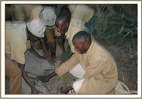 The Capture Unit involved in the elephant translocation which was based close to the area, were alerted, but suffered a vehicle breakdown en route to the calf, so our Voi De-Snaring Unit was summonsed. Taking back feeder roads, and in the company of a Ranger familiar with the area, they travelled the 50 miles to a small village named Bofu where the calf had last been seen, arriving at dusk. However, luck was with them (and the orphan) for villagers had again spotted the orphan feeding behind a thicket and were able to direct the team to the place. Having evolved a plan of action, the rescue team managed to surround the calf who fled, panic-stricken towards the thicket, but the team were able to close in from all sides and wrestle him to the ground after a pursuit of about 40 metres. As the calf was being loaded onto the back of the De-Snaring teams Pickup, having been trussed up, curious and wildly excited villagers, who had been watching from a safe distance, swarmed around the vehicle, all wanting to touch the recumbent and terrified animal. This must have been the worst nightmare for a baby elephant who had grown up so fearful of human contact, so Mweigas calming influence, and the presence of the other elephants back at our Voi Elephant Stockades must have come as a real life-saver!