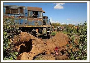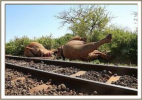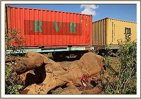 Most recently, two young bull elephants were struck by a train near Mtito Andei. They were attempting to cross the railroad in a place adjacent to where soil is being excavated for use on the new high speed rail that is currently under construction. The steep side of the excavation prevented them from being able to get out of the way quickly enough and they were both struck and dragged for more than 50 metres. The bull elephants were hit at about 2:00am and KWS were on site by 5:00am to remove their tusks.