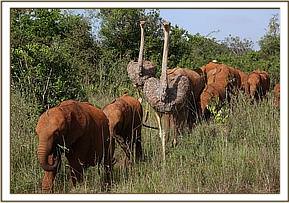 We rescued Pea and Pod October 2014 when our team of Keepers retrieved a little orphaned elephant called Wass from Northern Kenya. On the dry and dusty Milgis airstrip, our Keepers were unexpectedly handed two orphaned ostrich chicks by KWS Rangers who knew we could offer them a safe haven. Travelling in the same rescue plane as Wass, it was therefore quite a surprise for the team in Nairobi when the trio were safely unloaded, who were expected only a little elephant. These two tiny ostriches with little quill like feathers have grown up in the company of our orphan elephant herd, and orphan infant giraffe Kiko. During time here at our Nursery, they have become very much part of the elephant herd, dwarfing their elephant friends after only16 months old. An adult ostrich can grow to over seven feet high, and Pea and Pod are not far off that.