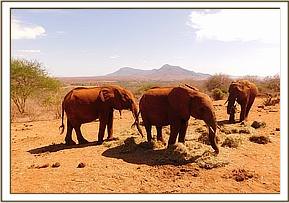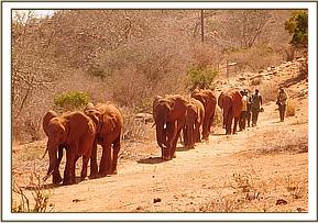 On the 17th of October, while on a regular fence patrol, the David Sheldrick Wildlife Trust (DSWT) Works Manager came across some of our Ex Orphans feeding on parched grass looking extremely hot, hungry and thirsty. It was Lempaute's Ex Orphan herd and as they were only 6km from the Voi stockades the decision was made to walk them back to where water is plentiful and a fresh load of Lucerne had just been delivered from Nairobi. This dry season has lapsed into drought conditions and while we are confident the rains are just a few weeks away we are working tirelessly to keep both the wild elephants and our own Ex Orphans provided with ample water with the Trust funded and managed 10 borehole installations throughout Tsavo, all of which are serviced and maintained ensuring the wild animals are not without water.