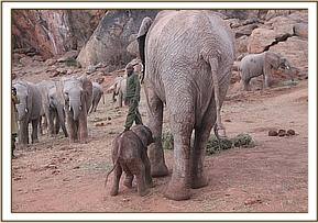 Thankfully it didn’t take long for Galana to regain weight and become a healthy little calf again, aided of course by the careful care and support she received by the DSWT team and the rest of the Nursery orphan herd, although during her early days at the Nursery she was quite a boisterous and pushy baby, showing her feisty spirit which later led to her becoming a mini matriarch in the Nursery.