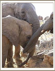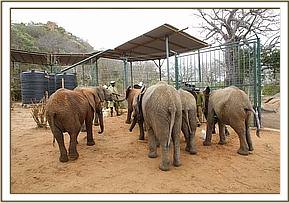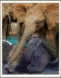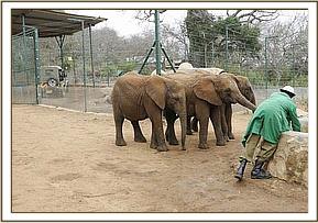 The elephants were fortunate to be able to travel in the cool of the day, but unfortunate in that the deviations on the Mombasa road were grueling, and the Kanziku stretch as they approached Ithumba, even more so. By 1 a.m., however, they had arrived at their destination. The lorries were reversed up against the Unloading Bays - favourite early morning scratching places for the Ithumba elephants before heading out to feed each day. Lenana and Chyulu had traveled well, and emerged calmly to enjoy their milk feed as the second truck carrying Makena was negotiating into position. As soon as its tailgate was opened, they rushed to greet Makena as she was coming out, obviously relieved that she was with them at the other end. However, Makena had taken the strain on the journey, and was clearly confused and disoriented as well as being visibly subdued even refusing to take her milk. The Nairobi Nursery had been her world for the past 3 years, for she had been a baby of just 3 months when she first came in and had now past her third birthday. The fact that her world had been turned upside down had taken an emotional toll on her. Lenana and Chyulu had been older when orphaned, so both could probably remember another wilderness world that was foreign to Makena.