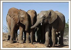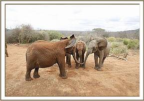 The Ithumba elephants, numbering 27 in all, were not actually present when the three newcomers arrived, but they arrived soon afterwards, and in a rush!. As always the reunion was vibrantly exuberant, the joy and excitement tangible, with trumpets, urinating and trunk touching, as the newcomers were given the warmest of welcomes into a new and larger “family”. Recognition by those that had shared Nursery time with the new arrivals was instant. Sian, who was the last to share a stable with Chyulu, rushed to her side, and remained glued to her thereafter, Naserian, and Lualeni comforted Makena, while Loijuk was enthusiastic in embracing Lenana. All the others crowded around, pushing and shoving to get close, laying trunks lovingly over their backs, while yet others rolled on the ground, and would have stood on their heads had they been able!