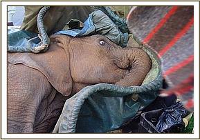 Not surprisingly, upon arrival in the Nursery, the elephant was very wild and extremely traumatised, trembling visibly, which is never a good sign. We decided to use Rapsu’s Stockade, (consigning Rapsu to the one next door to Naserian). Rapsu’s Stockade is the one usually used for older candidates who need taming down, for it has an escape platform where the Keepers can keep out of danger during this process for a calf, even if only a year old and weakened through malnutrition, is quite capable of inflicting serious injury. He was given water from a bucket, and offered greens, but because it was dark when the Vet arrived to administer the usual prophylactic anti-biotic, he and the Keepers felt it would be too risky to subdue the elephant under such conditions. The Vet left, but was asked to leave the loaded syringe in case we could inject what was necessary if the calf slept. However, since time is of the essence to avert death from pneumonia brought on by a depressed immune system, and especially since those who have had contact with cattle, and arrive in pitiful physical condition, are particularly at risk, Daphne and Angela decided that the antibiotic must be administered immediately, and that waiting until the morning would jeopardise his chances of survival. Hence, all available manpower was mobilized, a blanket thrown over the calf’s head, and a concerted effort pinioned him in one corner. Then, Angela, , very bravely managed to give the necessary injection.