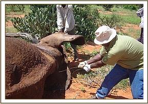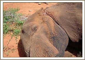 The David Sheldrick Wildlife Trust’s Mobile Veterinary Unit, funded by the Austrian NGO Vier Pfoten, has saved the lives of numerous animals in the three years it has been operational and the unit has been able to save the lives of over 100 elephants. Many of the wounds inflicted by wire snares, poisonous arrows, spear wounds, and bullet wounds. On the 22nd May Dr. David Ndeereh treated this particular bull with a snare around the head on the KMC ranch close to MacKinnon Road.