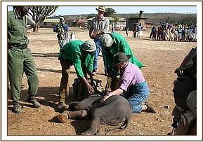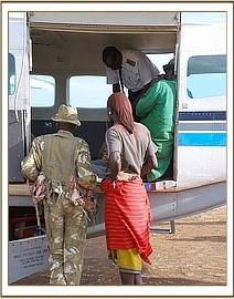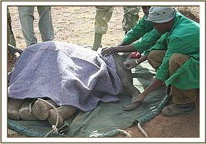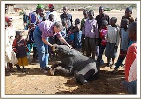 While the rangers and the Samburu men who first found the calf waited patiently at the airstrip for the plane to arrive, they ensured he was kept cool by pouring water over him which they ferried from the Mugie school situated on teh airfield. Guests of Clause Mortinson's (The owner of Mugie ranch) came down to the airstrip to be a part of proceedings and Cynne Flaconer-Taylor was able to perform 'body talk' on the calf and he responded immediately which amazed the curious onlookers.