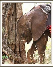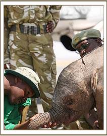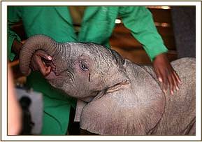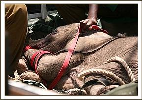 This baby bull who has been named “Kibo” was discovered in the well by Masaai elders who reported his predicament to the Amboseli Elephant Research Project . The calf was rescued from the well at 9.00pm, and was taken to the Amboseli Elephant Research Project Headquarters for the remainder of the night and there he was given water and covered in a blanket and watched over all night. Very early the next morning the Trust was called and a rescue plane and team mobilised. In the meantime the calf was driven to the Amboseli airstrip where he was able to warm up in the early morning sun as they waited for the plane to arrive. The Keepers were able to feed him some milk before preparing him for the flight back to Nairobi. Estimated to be about two to three weeks old, Baby Kibo was in good physical shape on arrival, but for extensive bruising on his back, almost identical to that on the back of Mawenzi. Obviously a priority is to try and sort out that well so that elephant calves that fall in can get out, and this is being addressed.