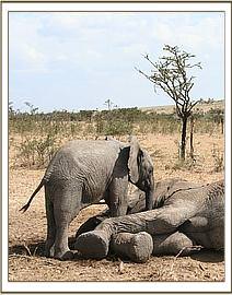 some 20 kilometers away so that the Keepers expertise could ensure an smooth and effecient capture of the calf. It was a heart-wrenching scene that greeted them, the mother attempting to protect the terrified baby who was clinging to her and climbing on her in an attempt to evade a hated enemy responsible for the suffering of her adored mother. There were no dry eyes that day as the Keepers moved in to try to capture the baby once the mother was darted to immobilize her and prevent her flailing trunk from injuring the men, and to minimize any further stress.