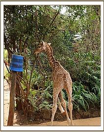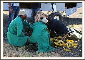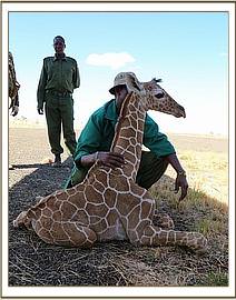 He was flown to the Nairobi Nursery by Sky Vet, sparing him what would have been a gruelling and very hot seven to eight hour journey by road and being the first time our Keepers had been involved in the rescue of an orphaned giraffe, they were fully briefed about the necessity to ensure the giraffe’s head remained upright at all times throughout the flight. On this occasion the usual elephant-rescue tarpaulin had to be modified into a make-shift cradle and throughout the entire procedure the little giraffe was seemingly totally resigned to whatever lay in store for him.