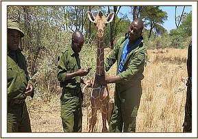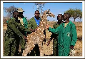 On the 19th of September KWS Officer Bernard Rono, who heads the DSWT funded Meru mobile Veterinary Unit, reported having received a baby male reticulated giraffe estimated to be just one week old, which had been rescued by KWS rangers on the Meru National Park boundary