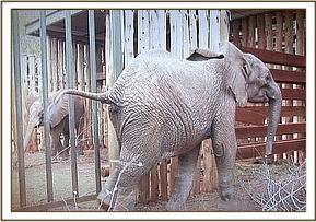 By the time the Voi keepers arrived, othe DSWT antipoaching team had already caught the calf and restrained it waiting for the keepers to arrive. The calf was over two years old and we decided to raise him in Voi, company for Bada another recently orphaned youngster rather than air lifted to the Nairobi nursery. The team drove the tuskless calf to the Voi Nursery. On arrival she settled quickly with the close company of the other orphan Bada, approaching the keepers for a milk bottle in no time. The two later went to greet one another with trunk touching in the taming stables and it was clear they were going to grow to become great friends.