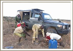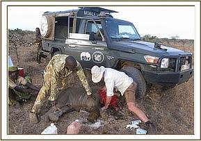 The DSWT/KWS Meru Mobile Veterinary Unit headed by seconded KWS Veterinary Officer Bernard Rono was called upon to respond immediately. The tiny snared elephant was in a herd of 30 elephants who seemed agitated when the land cruiser approached. The injured calf’s mother had to be darted as it would have been impossible to otherwise treat the tiny calf. Once his mother was asleep the team were quick to restrain the baby to avoid the risk of anesthetic and cut away the snare and necrotic flesh which must have been causing him unspeakable agony. The snare was on the right forelimb and had cut through the skin causing a deep severely infected wound and the foot was extremely swollen. After the wound was cleaned, antibiotic and anti-inflammatory drugs were administered by intramuscular injection and finally green clay applied.