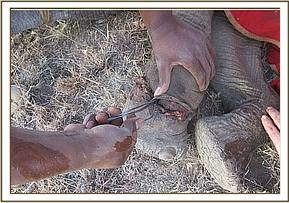 On Ngorare Ranch in Rumuruti the ranch manager reported on the 8th of Ferbruary news of a tiny baby bull elephant with a snare wound tight around his leg.