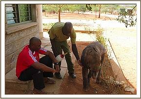 The herd had obviously made the decision to abandon the calf and head to the safety of the Park Boundary well before day break. The Manyani recruits and rangers rescued the calf and kept her in a stable at the training academy while they alerted our team and waited for our Voi Keepers and milk to arrive on site. Sadly despite everyone wanting to try to reunite the calf with her elephant family neither her herd nor any elephants for that matter were located in the area so any possibility of this happening was ruled out.