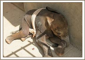 Right from the outset Ashaka has been full of boundless energy. We estimated her age on arrival to be around the three week mark as she came to us still without teeth. Ashaka being so young seemed not to miss her elephant family and adapted to her new environment quickly , soon becoming totally attached to both her Keepers and her milk bottle. A hanging comfort blanket has given her endless hours of enjoyment out in the forest and in her night stable which she shares with an elephant Keeper each night, receiving milk 3 hourly 24 hours a day. She loves to wriggle her trunk around it, resting on it, and taking her milk from under it. Her stable is next to Kamok's, and she spends her days in the forest with her tiny elephant friends as we have a few babies her age at the moment.
