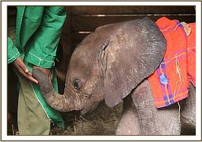 Angela at The Sheldrick Wildlife Trust headquarters was called and a rescue arranged to collect this tiny baby by aircraft to fly her to the Nursery where she could received the intensive care infant babies require. We have called her Ashaka, after a watercourse in Tsavo East National Park. She arrived safely in Nairobi and was immediately introduced to the other tiny babies in our care and soon settled into the fold.