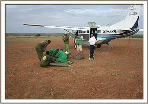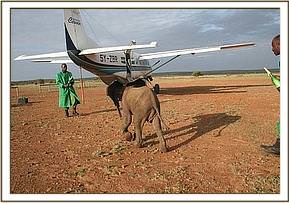 At first light the rescue plane took off from Nairobi, armed with three Keepers, all the rescue paraphanalia, milk, rehydrants and the usual medicaton and headed for Loisaba in Laikipia district. The little elephant arrived in the Nursery ahead of Daphne, Angela and Robert, who were traveling by car from Tsavo at the time.