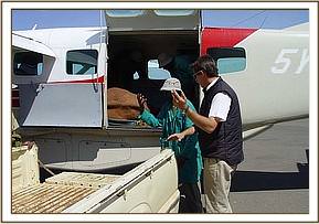 A plane was hurriedly scrambled in Nairobi aboard which were all the necessities for an air rescue; three men, the milk, and the circular carrying tarpaulin, headed for Voi, to where the larger Caravan aircraft (on another charter) would be diverted on its return journey to meet them and bring the elephant back to Nairobi. The new orphan arrived in the Nursery at 3 p.m., again without having to be sedated for the flight but instead manually restrained with legs tied.