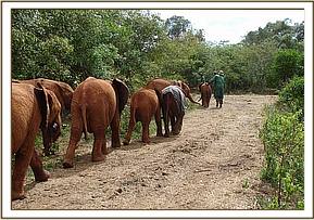 Having completed their business in the nearby town of Mtito Andei, they returned to capture the orphan, who was still in the same place and who did not put up much of a struggle. His legs were bound, and he was transported to the nearest airfield at the Kamboyo Park Headquarters of Tsavo West National Park, where he was secured to a tree in a standing position, to await the arrival of the rescue plane on its way from Nairobi and cooled down with wet mud.